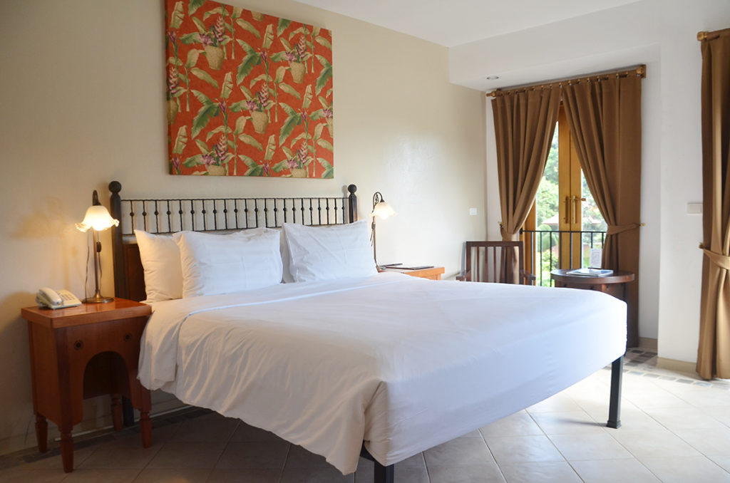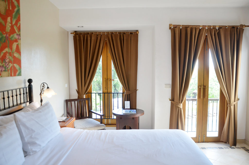 The bedroom is spacious with a large comfortable king-size bed, a small coffee table with a comfy chair, large flat screen TV, and a small balcony. The room is designed in natural colors complemented by classical wood furnishing on some tiled floor, giving the room a very rustic feel.