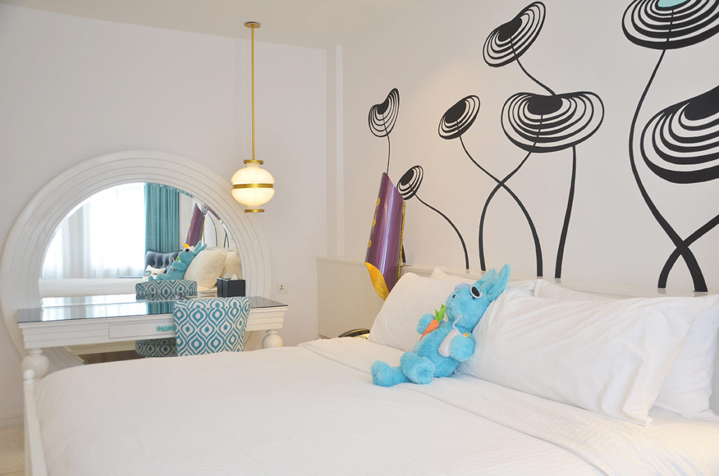 The room sports a white and blue theme, making it very hip and fun. Right in the middle of the big white bed also lies the iconic rabbit of Dash Resort.