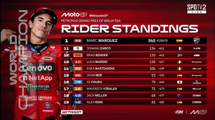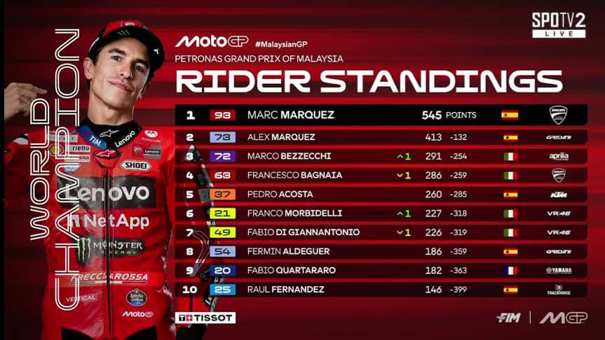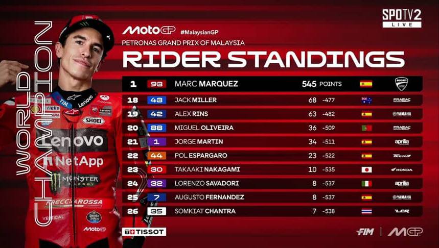 With Marquez’s win, his runner-up position in the championship is now mathematically secure. The fight for third overall remains wide open, with Marco Bezzecchi and Bagnaia separated by just five points, while Acosta remains 31 points adrift and still in contention.