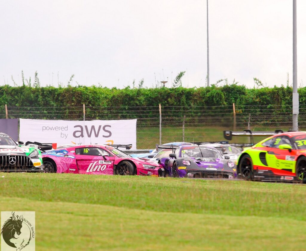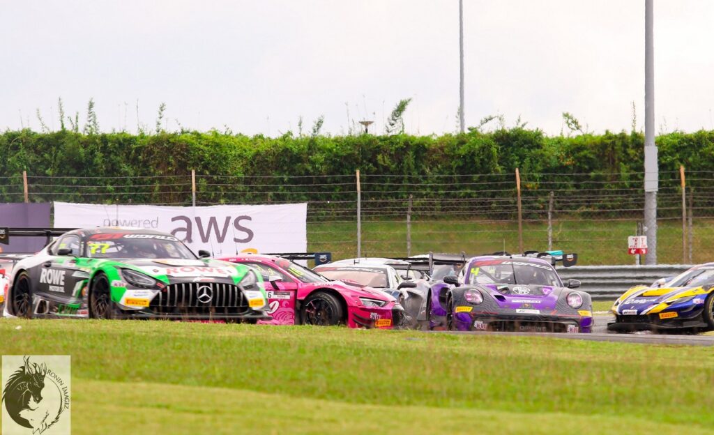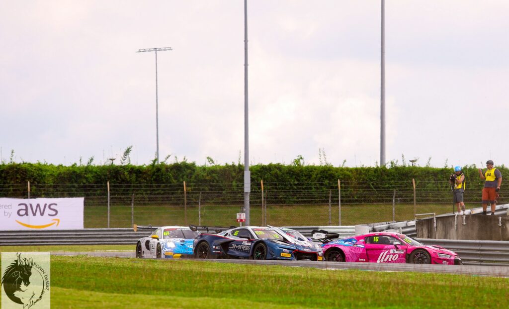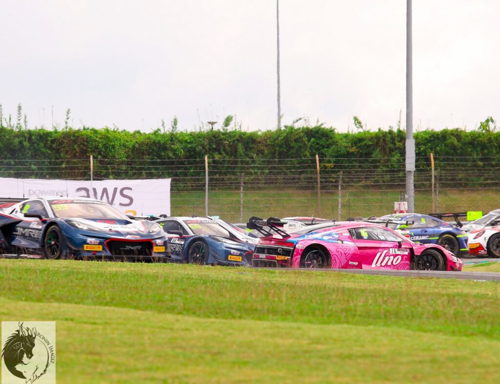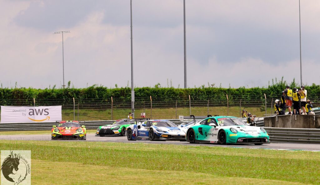 A poor getaway dropped Uno’s R8 from second to fifth before contact sent Thong around at the apex. He was collected side-on by Prince Abu Bakar Ibrahim’s Corvette, which continued to the pits with damage, while Origine’s #86 Porsche and EBM’s 911 lost time in the incident.